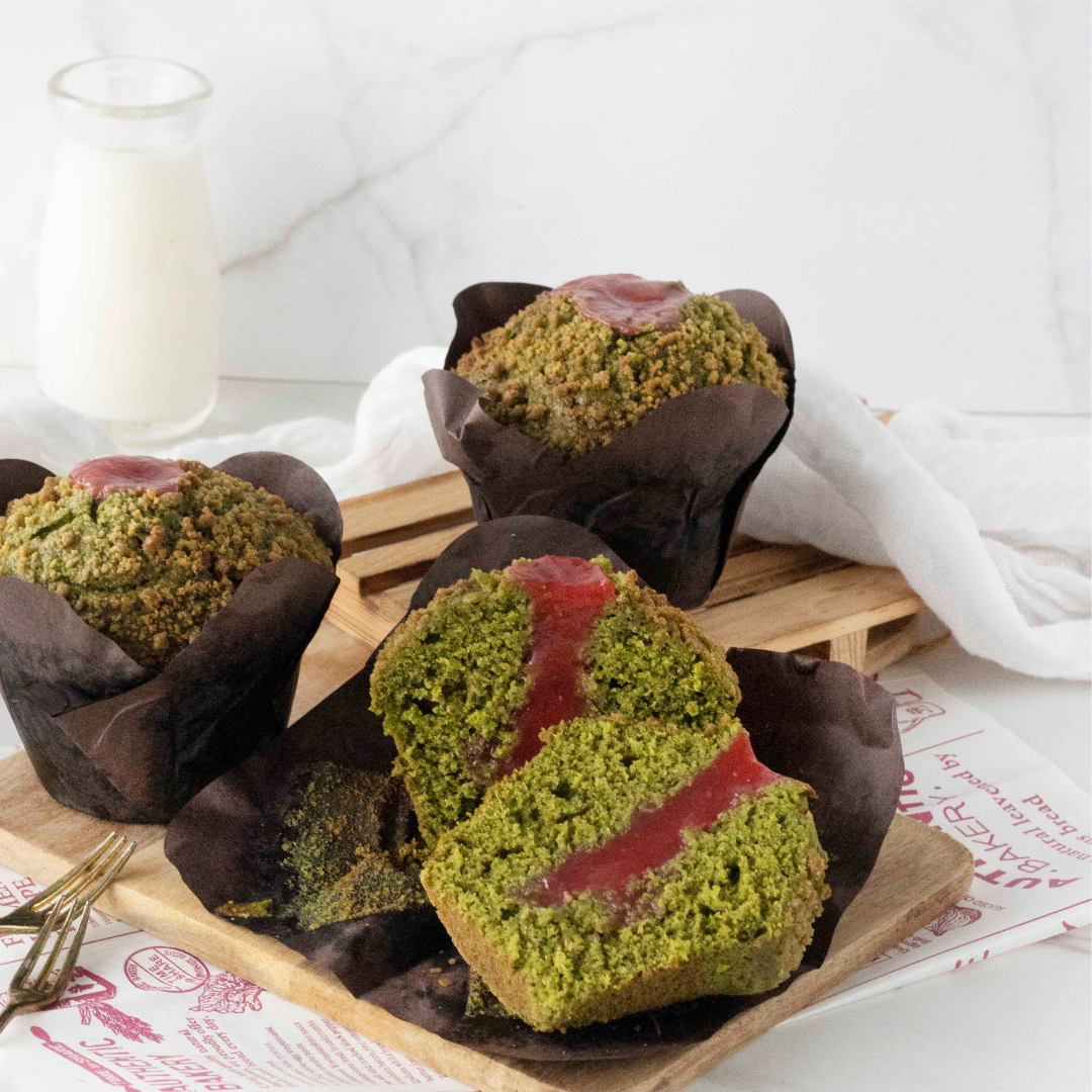 Ingredients: Sugar, egg, water, wheat flour, canola oil, wholemeal flour, strawberry puree, icing sugar, matcha crumble, wheat starch, green tea powder, lemon juice, modified food starch, baking powder, vanilla flavour powder, emulsifier, vanilla flavour, guar gum, sodium alginate, strawberry paste, salt, sodium bicarbonate