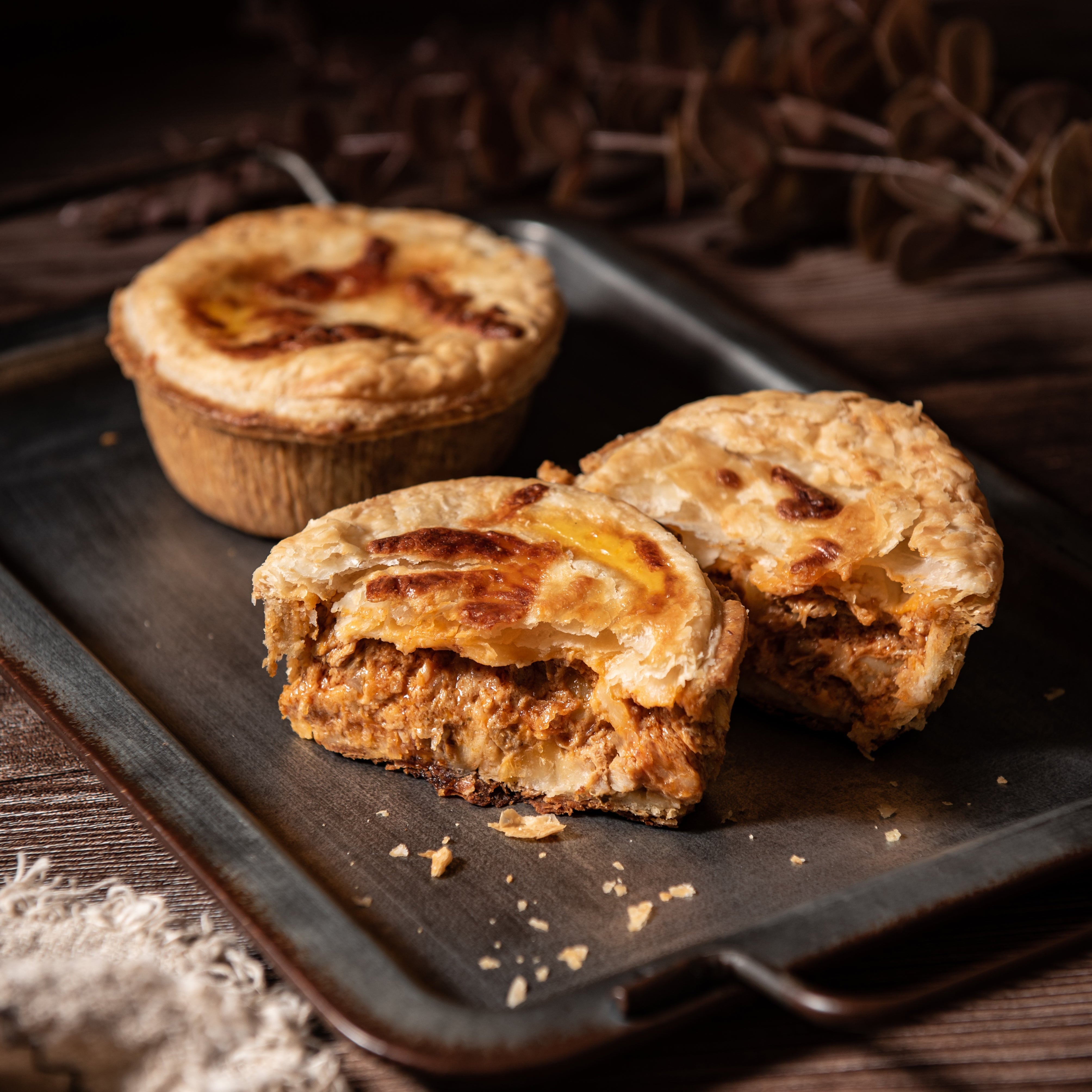 Chicken and potato mixed with an authentic spice blend of red chili paste, tomato paste, onion and fresh yoghurt enclosed in a flaky buttery pastry. If you are a fan of Indian cuisine, then this is just the pie for you.