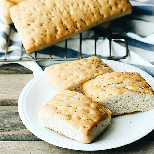 An oven-baked Italian flatbread topped with olive oil and aromatic herbs like rosemary and oregano.