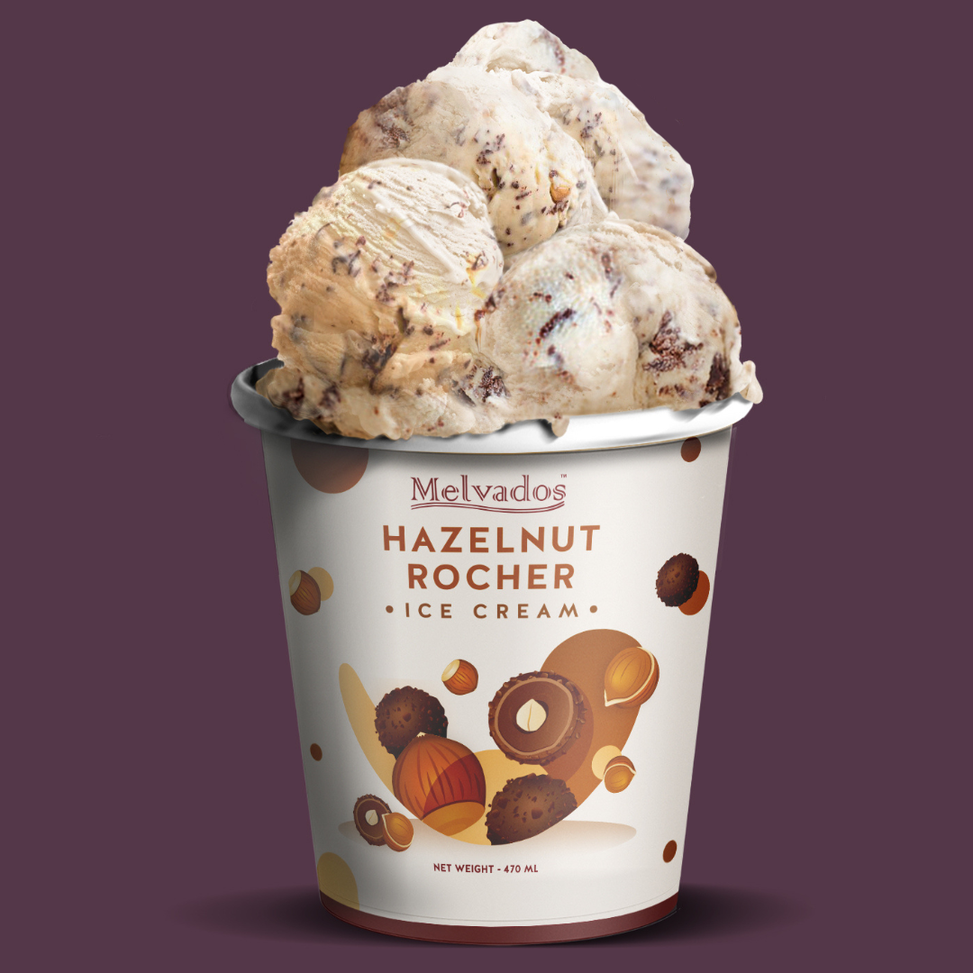 A luxurious treat combines creamy hazelnut-infused ice cream with crunchy pieces of chocolate-covered hazelnuts.