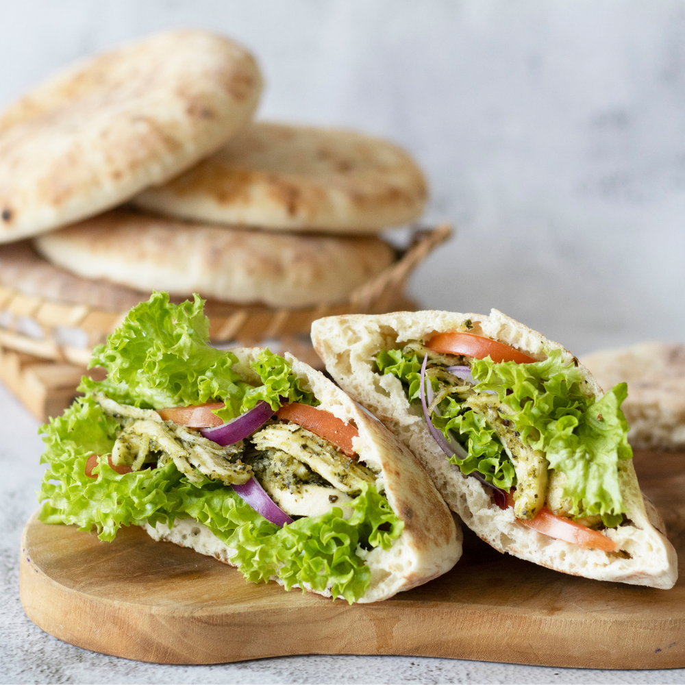 Baked sourgough pita bread with a fluffy inner pocket.