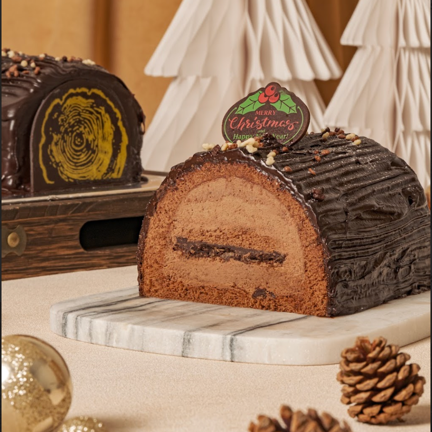 A delicious and decadent chocolate truffle log cake made with a light sponge and layered with milk chocolate mousse. Covered in a semi-dark chocolate ganache.